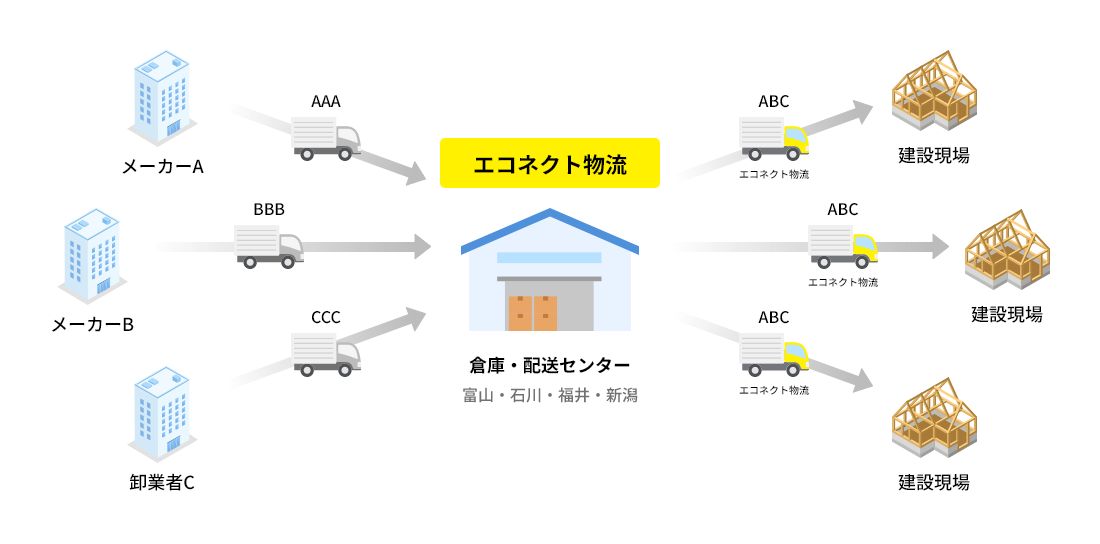 エコネクト物流は、北陸エリア(富山、石川、福井、新潟)を拠点とする建築資材専門の運送業者です。資材メーカー・商社・卸業者からの建築資材を当社倉庫に集約し、保管、配送いたします。北陸の中継センターとして、2024年問題による長距離輸送制限に対応し、コスト削減と納期遵守を両立します。また、建設工程に合わせて必要な資材を分割配送することで、現場の省スペース化と作業効率の向上を実現。経験豊富なドライバーが丁寧に取り扱い、破損やキズのリスクを最小限に抑えます。保管・管理・配送までをワンストップでサポートし、建築現場の円滑な進行を力強く支えます。