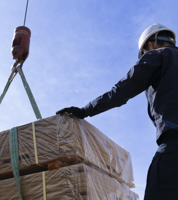 住宅建築に使われる木材を、当社の物流センター内でフォークリフトを使って搬送する仕事です。